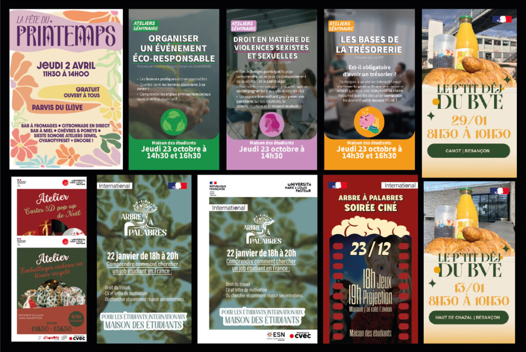Au-delà des grands projets, j’ai assuré la conception de l’ensemble des supports de communication pour les différents micro-événements de l’année, renforçant ainsi l’identité visuelle du BVE.